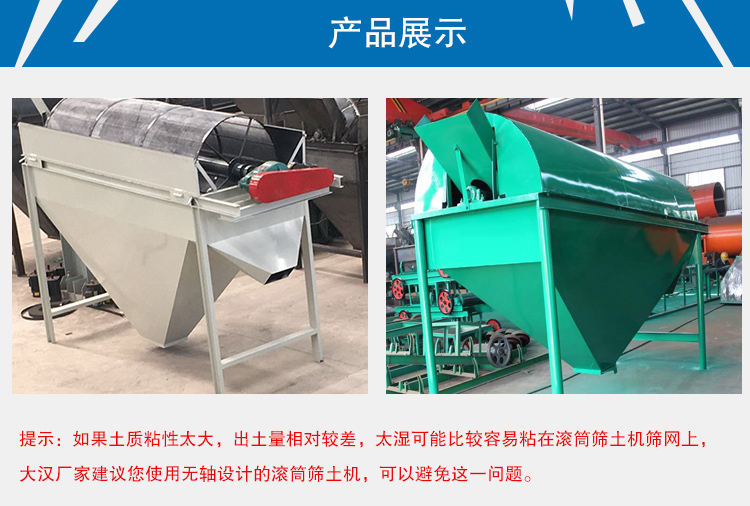 提示:如果土質粘性太大,出土量相對較差,太濕可能比較容易粘在滾筒篩土機篩網上,大漢廠家建議您使用無軸設計的滾筒篩土機,可以避免這一問題。