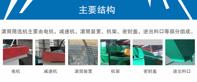 滾筒篩選機主要由電機、減速機、滾筒裝置、機架、密封蓋、進出料口等部分組成。滾筒裝置傾斜安裝在機架上,電機經(jīng)減速機與滾筒裝置通過連軸器連接在一起,驅(qū)動滾筒裝置繞其軸線運動。