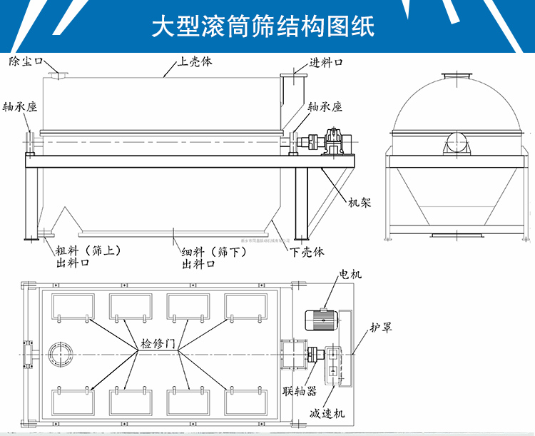 大型滾筒篩主要有電機、減速機、滾筒裝置、機架、密封蓋、進出料口組成。滾筒裝置傾斜安裝于機架上。電動機經減速機與滾筒裝置通過聯(lián)軸器連接在一起,驅動滾筒裝置繞其軸線轉動。